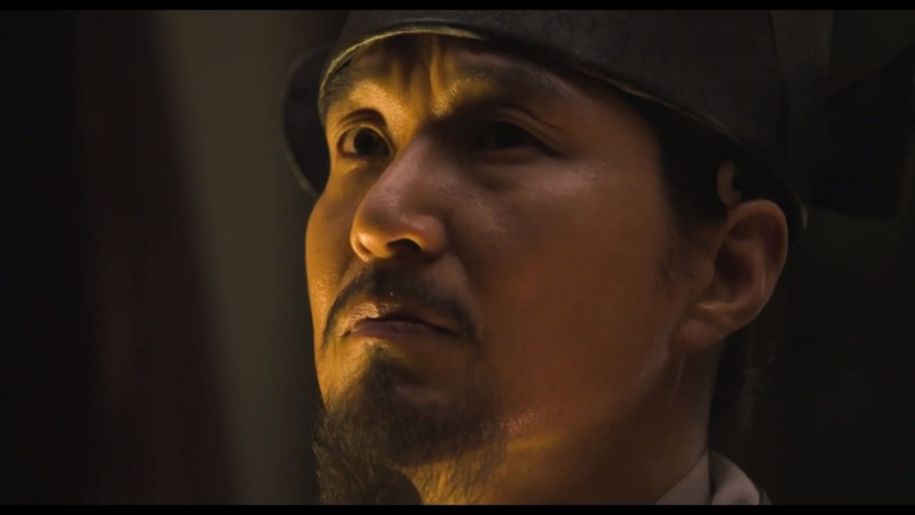 As a matter of fact, I spent most of The Royal Tailor lost. As characters whirled from one side of the screen to the other, I couldn’t tell from where they came or where they were going, how one plot point moved logically to the next. For example, Gong-ji sees the queen cry as she relates her backstory, and this moves him to mass-produce dresses which is what gets him into trouble? Each scene made internal sense, but the big picture was vague in the first two acts. That’s a lot of acts, and that adequately captures my experience. It was something like an altering of consciousness — to ascribe maybe way too much power to a movie viewed in two sittings* — reconfiguring that analytical mind, empty of knowledge in fashion or the Joseon Dynasty, toward the film’s own language, one however shared with other movies and TV shows. Trope-studded machinations still require execution, and while the unspecific aesthetics and art design wouldn’t seem to suggest conspiracy, I was close to tears by the end. There’s a crispness, a wide clarity of image, and each scene becomes a theater stage, not a pattern of shadows. Actors are performing big, with their whole faces and bodies, and this also accentuates the quieter moments.