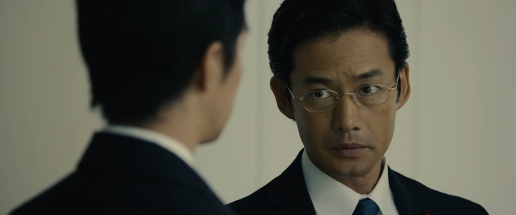 So, who are these people making these tough choices? The movie introduces everyone with on-screen text, as if daring us to play detective, matching the fictional character’s title to their real-world counterpart in March 2011. We’ll determine if Higuchi and Anno are calling anyone out. There are a lot of these chyrons, by my count around 80, but of course we’ll narrow it down to the bad actors. How do we tell who in Shin Godzilla gets the blackest eye? We’ll use the Rando Rule: marking down anyone who disagrees with our hero. As a result, I’ve got five: Chief Cabinet Secretary Ryuta Azuma, Deputy Chief Secretary Koriyama, MLIT Minister Yanagihara, MEXT Minister Sekiguchi, and of course, Prime Minister Seiji Okouchi.