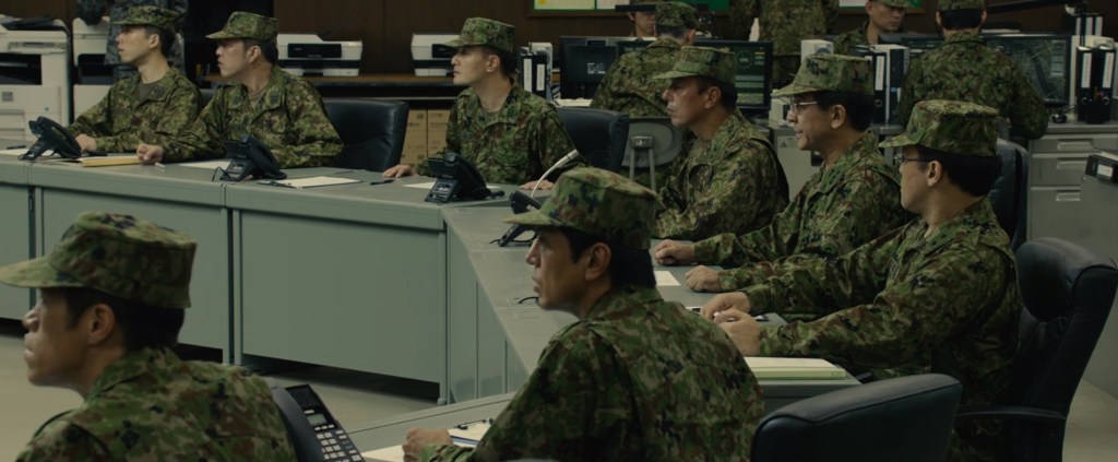 Maybe this is another trap, I don’t know. It’s tempting for me to focus on these more universal qualities: psychology, emotion, rather than face what is, of course, a very political film, and possibly a nationalistic one. Now, because I’m not from the nation in question, I should be offended. But seriously, is there something here? You know, Shinzo Abe thought this was a great movie, and he’s the worst. It’s a movie about Japan’s place in the world, about how the apparatus that exists may be restructured to solve an impossible problem — a fantasy of a government working well. And like the American Godzilla movies, there’s a whole lot of military. Unlike most other Godzilla movies, the military kind of saves the day, and we’re sure to know exactly who does what and which plane is which and what operation. No country out there is trying to be merely adequate, so where do we draw the line between pride and pointy nationalism?