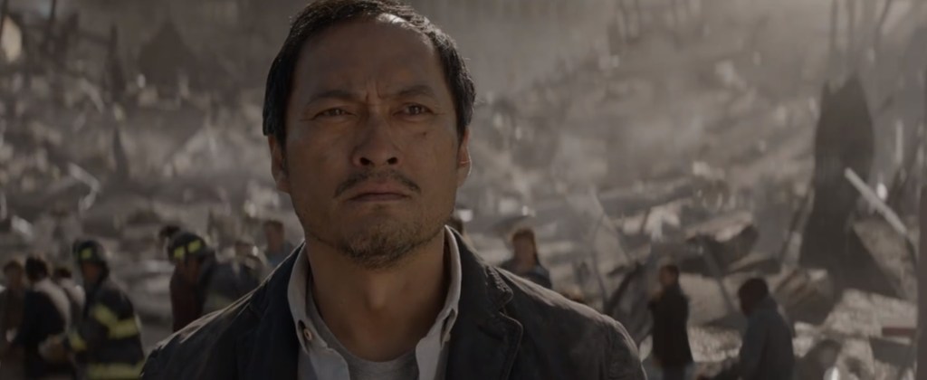 After Ford apologizes unconvincingly to his dying father for not believing him about monsters, Joe tells him to keep his family safe, whatever it takes, and that’s interesting. What does it mean to protect one’s family in a world of giant monsters? You can’t fist-fight Godzilla, so this is an actual dilemma. You don’t have to be a fist-fighter kind of guy, and you can see where I’m going with this. Why must Ford be the military Guy Who Can Do Things, and why does this instinct exist in American filmmaking, that we have to identify with — first of all, anyone — but especially the guy who’s the most capable in the room. There is no room, okay? There is no room. The giant monster took the ceiling off. Ford will spend the movie running around and defusing bombs and rescuing kids, and this answers the dilemma. Given the amount of facetime the military gets, again, there’s something here — the sacrifice inherent to duty. For the whole movie, he isn’t around his family. That should mean something, right? That should be acknowledged, or reflect on the character. Maybe it tries, but slipped off. He’s so passive, he just moves from scene to scene and sits down to listen to new exposition. And in fact, it’s strange how he starts out in the military and comes home and then has to argue his way back on later. Like, sure that’s fine, but then he doesn’t do anything when he returns home! So let’s imagine if he didn’t. What if we felt that separation from his family because we’ve never seen them together? You can do a lot with dialogue over the phone to establish a relationship. And this way it could be framed that he’s specifically fighting to get back home, rather than have him fight to get away from his home when he could choose to leave at any time.