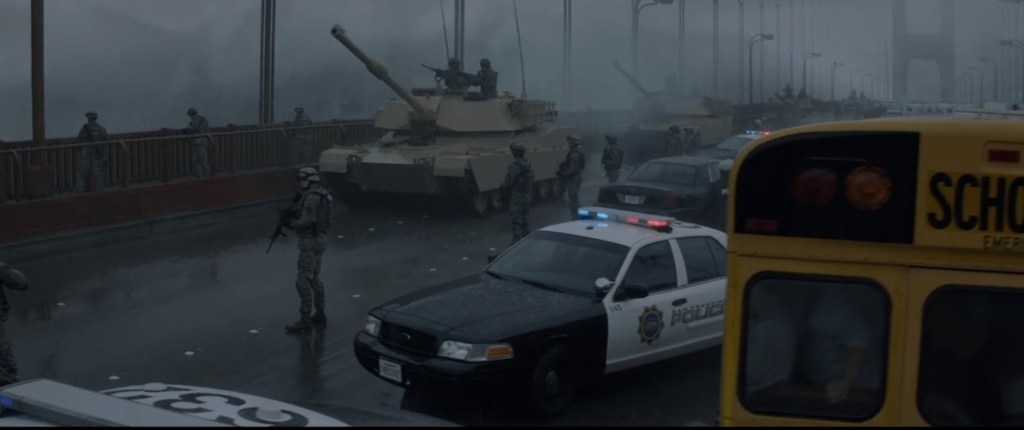 In the end, it’s the old out that maybe institutions cause problems, but outstanding individuals can always fix them, and yeah, this military needs a proactive thinker like Ford “the bro” Brody because even though they talk about civilians on the bridge, once Godzilla shows up they start shooting the bridge instead of evacuating it. What could be meaningful chaos is just chaos. In retrospect, the much-maligned destruction of New York by the military in Godzilla ‘98 rings true, that the military isn’t the answer to every problem. There are contexts in which they are inappropriate, perhaps urban areas. Call it a critique by an outsider, like German-born Roland Emmerich, if we take the social commentary along with the stereotypes. Even generous meaning is missing on the bridge in 2014. The tension comes from this inability to evacuate, but then the bus driver with the kids simply drives away. In Reptilian, at least the bus jumped over a gap. First of all, was I supposed to care about Ford Brody Jr.? This family is getting less interesting with each generation. But more importantly, the tension actually comes from a lack of visual data. It’s a set piece, and that requires a goal, a fail state, and a complication. If you beep your horn and drive forward, that doesn’t feel like a victory.
