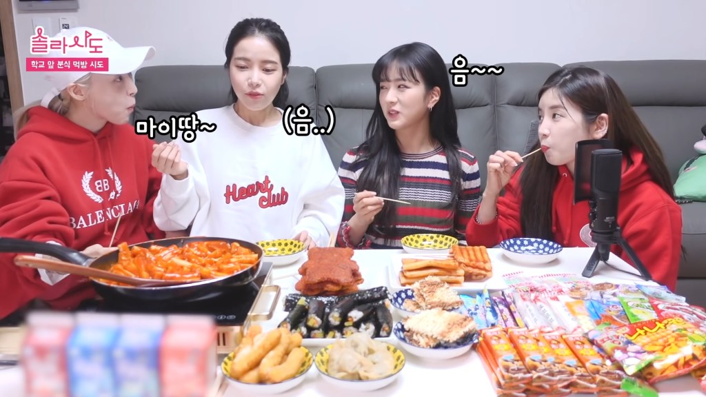 Another thing I’m beginning to see with Solar is that she’s shyer than you’d expect, but definitely wants to have some K-pop friends (like with Moonbyul and Seulgi). In the above image, she’s hosting a mukbang with Chobom, and in a different video, tries to call both Bomi and Chorong as part of a “say Happy New Year’s to people” challenge. (They didn’t answer — she’s always calling people and they never pick up). And I just get this sense that she wants to befriend Irene, but… how do you do that?