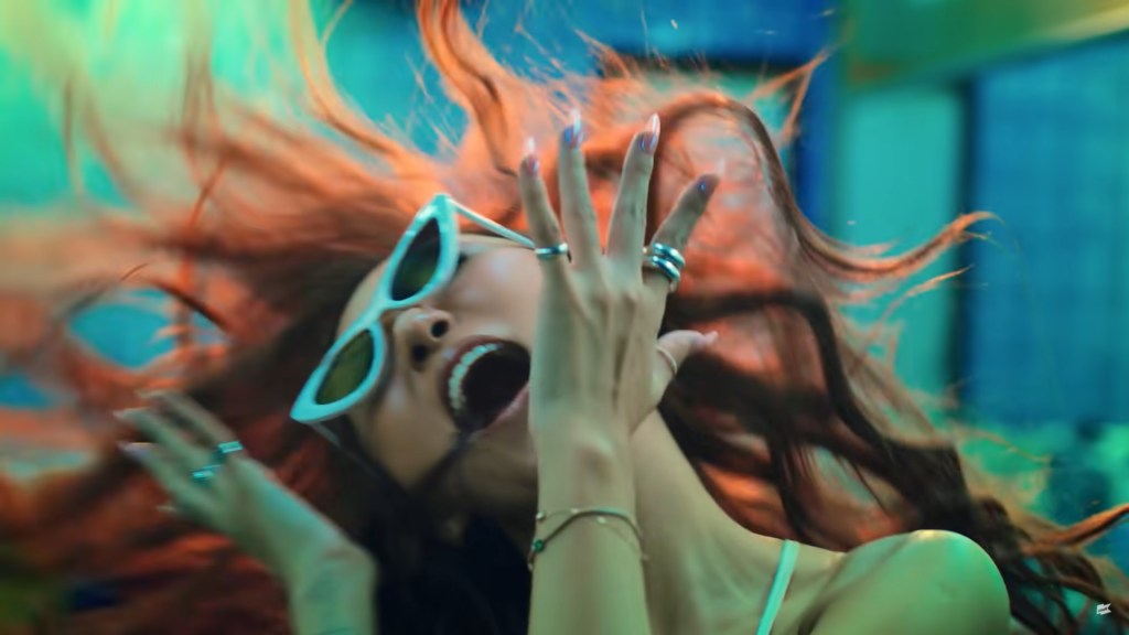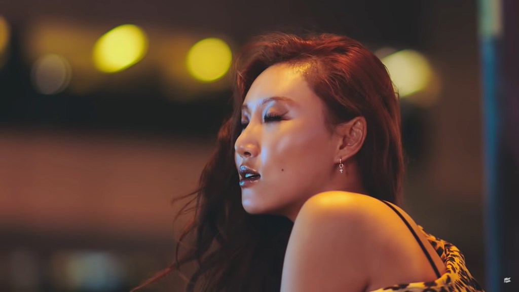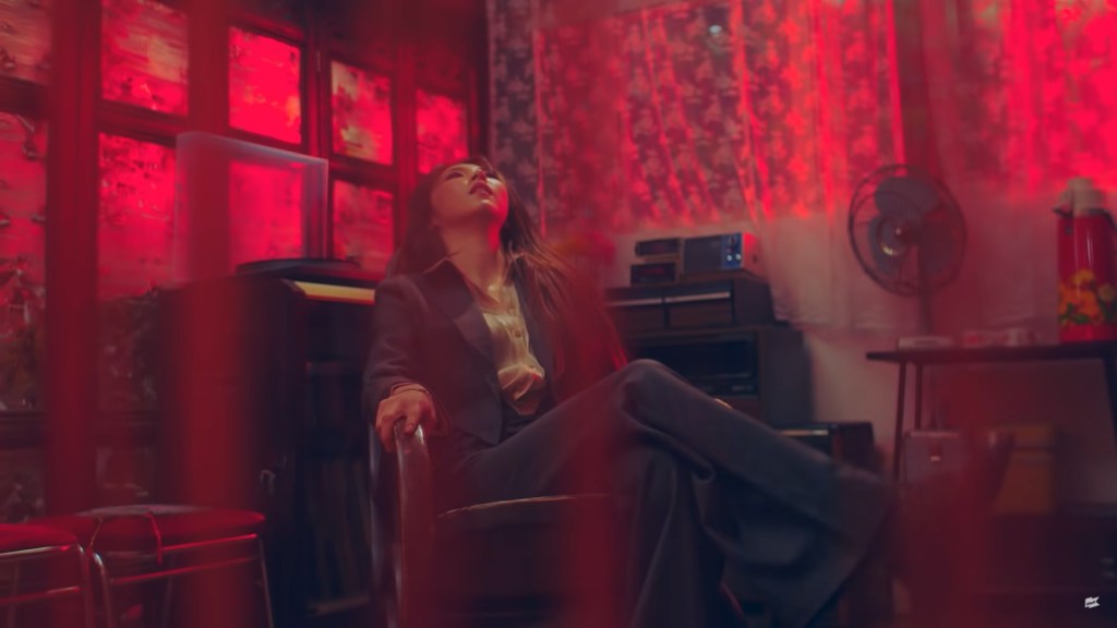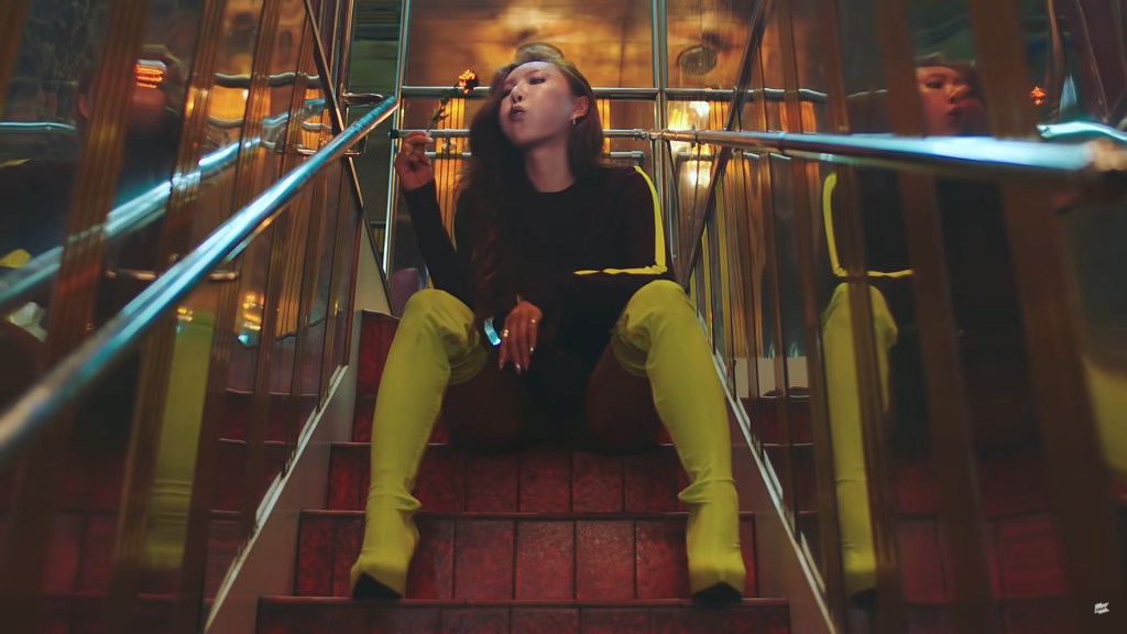 We move into the first chorus, and the tempo picks up. Hwasa starts dancing in this salon, and when she tilts her head back, it’s slow-motion. Wild but graceful.