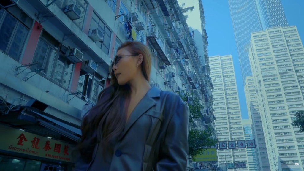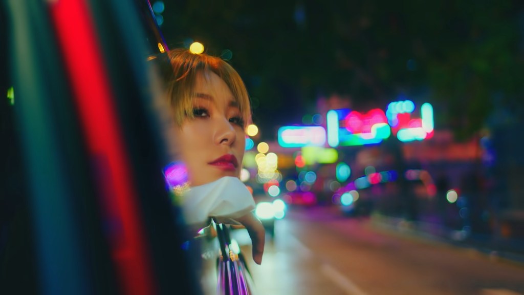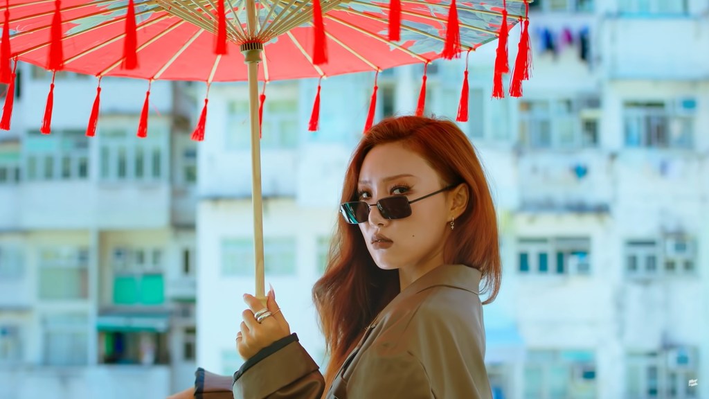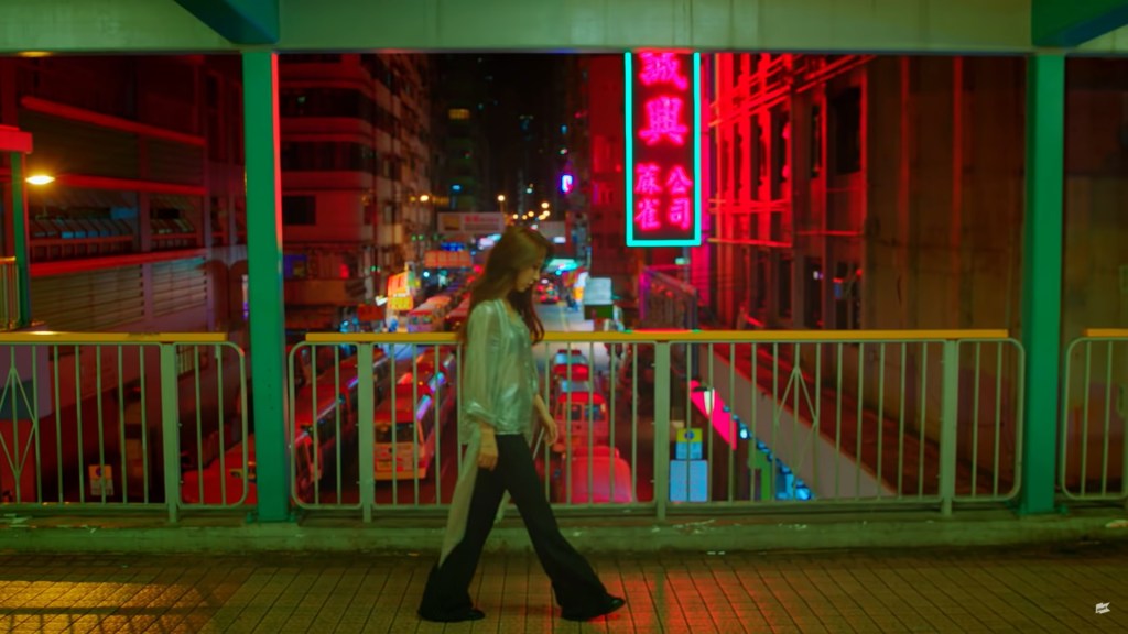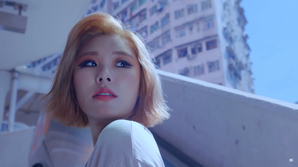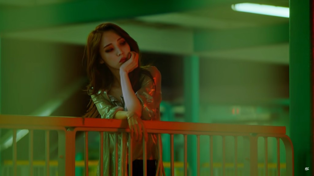 Moonbyul walks along a footbridge overlooking a busy street. I love the colors here, the neon and the sharp contrast. I say I’d love to visit Hong Kong, but I’m sure I’d find it overwhelming. I just moved back home from Los Angeles, so I couldn’t even handle a make-believe city.