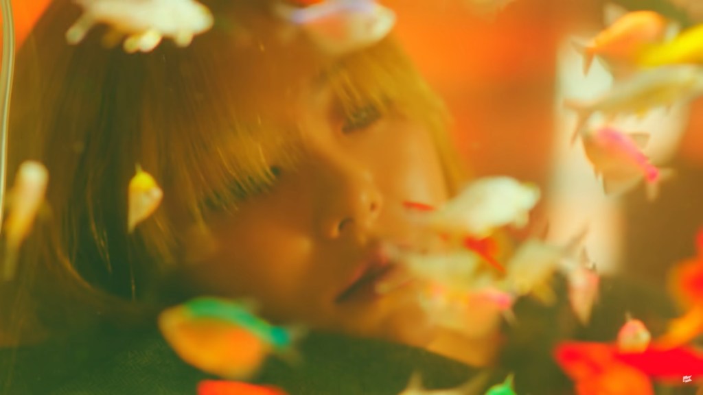 This is Wheein gazing at the fishes, wondering, perhaps, what that life must be like. As for the themes of the song/video, Hwasa had this to say, “In the music video, we represent the different emotions a person feels after a breakup, and the four of us each represent regretting, reminiscing, feeling conflicted, and overcoming.” So actually, Wheein might not be thinking of anything, just addled with the pain of love, and indeed the stare is pretty blank. She just looks so sad.