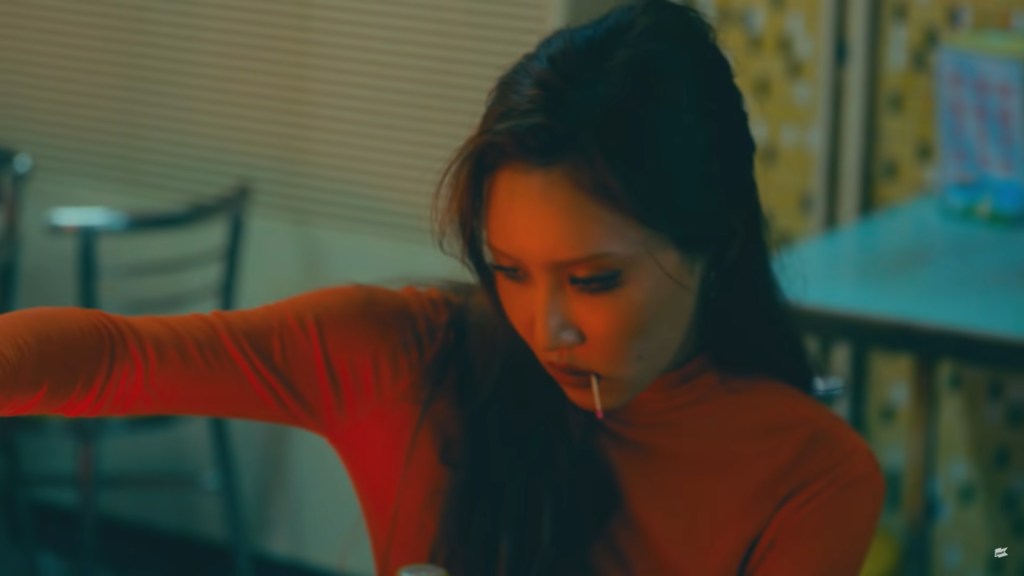 The song “ends,” and then there’s way too many narrative beats in total silence. The music starts up again and the girls are smiling and dancing through the streets. They end up in an empty bar, and though this isn’t a great shot composition-wise, I like it for some reason. Hwasa is pouring a drink and she has a toothpick.