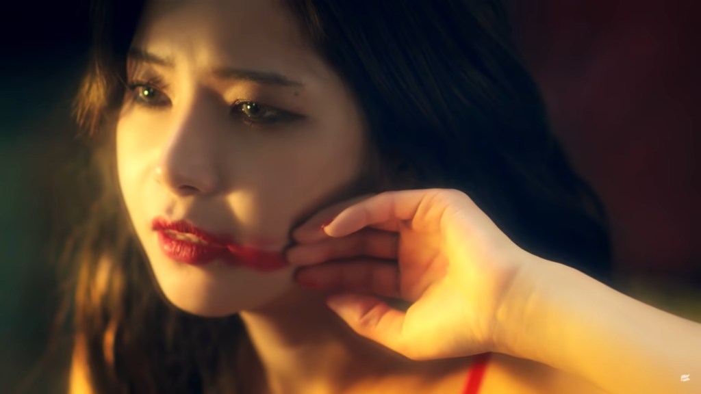 Solar swipes her lipstick into an accidental Chelsea grin, and in a subtle and remarkable bit of acting, she looks up at the mirror and expresses a sudden shock that instantly dissolves into resigned dread. As Solar had told Chorong in an interview (between them), she had done some acting training years ago, but maybe it didn’t stick. Music video acting and K-drama acting is surely different, but as we go on, we’ll see just how much of a performance Solar puts on each time, no matter the occasion.