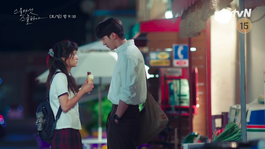 Part of why I’m writing this second K-Drama Report is to express my surprise and disappointment with how quickly the pen pal thread was resolved. Twenty-Five Twenty-One has been a great writing lesson, applying at least one principle I learned watching Squid Game, which I can only think of as “twisting the knife.” In the latter case, a lot of character had to be built up in a compressed time, and actively, but when the big dramatic climaxes came, they were overwhelming. It’s as if the writer asked, “How can I twist this knife?” What do I need to have established beforehand for the maximum possible effect? In the case of a betrayal, make sure that we care about the trust being broken. In Twenty-Five Twenty-One, it’s less elegant but still effective, that before Hee-do and Yu-rim’s first duel, we flash back to their actual first duel, as children, which Hee-do’s clearly forgotten and Yu-rim lost because she was “Afraid. Afraid of Na Hee-do.” I was anticipating another moment like that when Hee-do sees Yi-jin with the yellow rose and assumes he’s been her pen pal all along. At episode eight’s cliffhanger, she tells him, “I have to have you.”