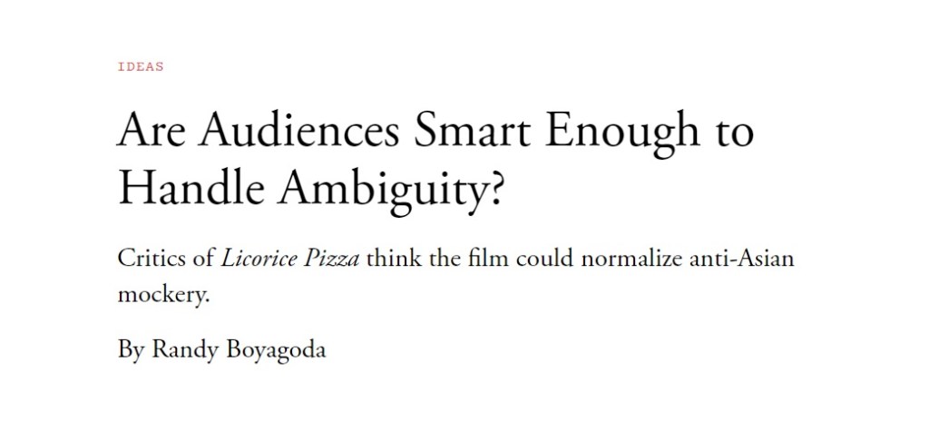 I realize I’m late here, but come on. This article in The Atlantic is so shockingly bad I’m amazed it was published (and continues to be referenced, which is how I saw it months later). Because there’s no immediately visible comment section, I’m actually gonna use this blog post to retweet it. The very title, “Are Audiences Smart Enough to Handle Ambiguity?” is a question answered by itself, but before we continue, let’s have some context. There’s a movie Licorice Pizza, and some Asian people got mad because of an allegedly racist character speaking racistly to Japanese characters. Says Randy Boyagoda:
