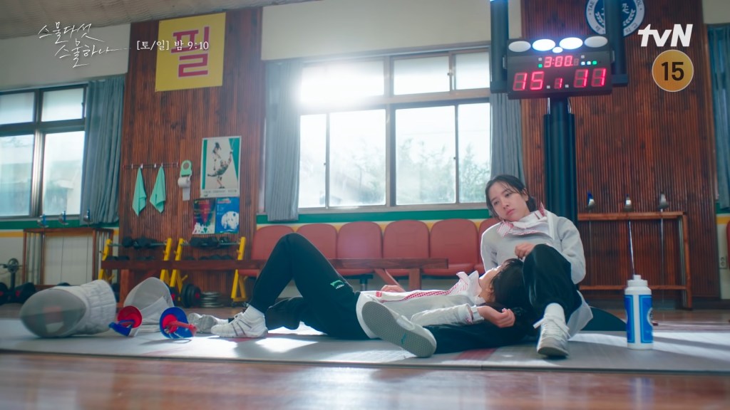 While fencing has taken a narrative backseat, Hee-do’s duel is sweeping and dramatic, with a great piece of instrumental music setting her up for those characteristic victory screams. Episode 13 issues a couple of correctives I may have needed, like providing a payoff to Ye-ji, that defecting fencer who occupied Hee-do and Yu-rim’s A story last week. As much as I enjoyed Hee-do and Yu-rim’s parental collaboration, I felt like both Ye-ji’s exit from fencing and Seung-wan’s exit from school were rare creative missteps, making for the series’ worst episode yet. Brief as it was, Ye-ji’s return as the team’s cheerleader was a nice addition to the swell of emotions for Hee-do’s final duel. And then of course, early in the episode, Hee-do complains that she misses when Yu-rim was cold and cruel to her, instead of constantly supportive and kind. It’s not a corrective exactly, but something I do agree with.