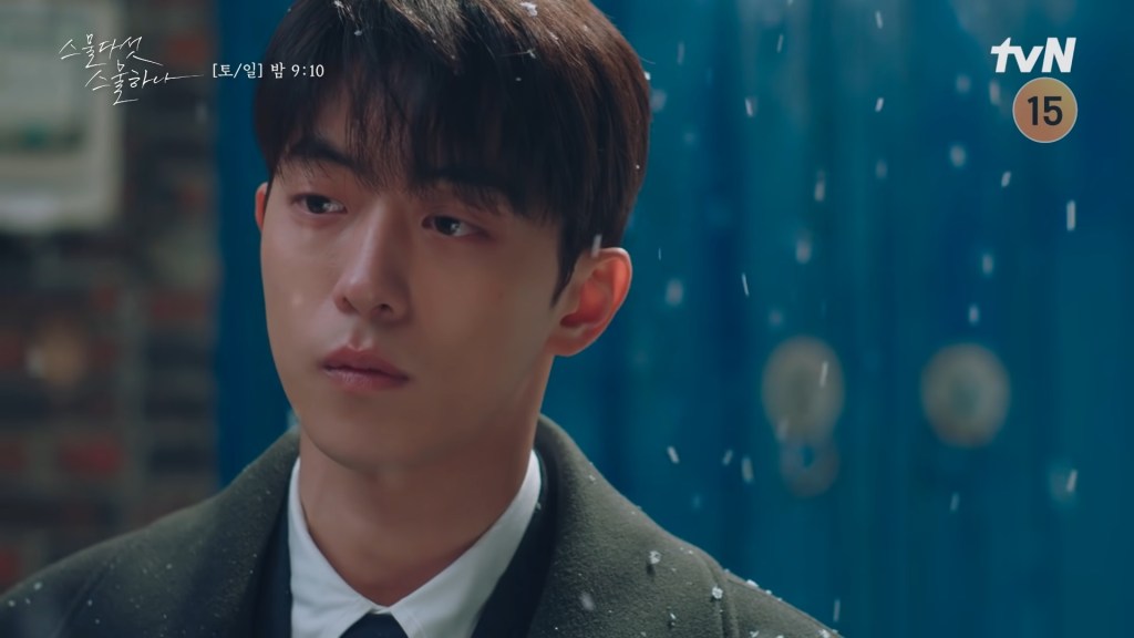 Just before starting episode 13, I wondered, “When’s the plot gonna start?” and on cue, it’s here that the story begins to come into focus. Or, if not “story,” at least the nexus of all the show’s elements, delivered by our most intriguing character, Coach Chan-mi. I think it’s a little bit funny how Twenty-Five Twenty-One posits that most ancient rivalry, between fencers and news reporters, but it does make sense especially when abstracted from the framing. Part of what weighs the drama of this episode is our knowledge of Baek Yi-jin’s struggle to regain his place in society. While bearing his mark of shame, he’s taken up odd jobs and eaten a lot of shit at the bottom rung. Though every authority figure in his life advises against a personal relationship with Na Hee-do, he can’t simply leave the newsroom because we know what starting over means. And suddenly, standing there in the snow outside Yi-jin’s house, the times have once again conspired against Hee-do.