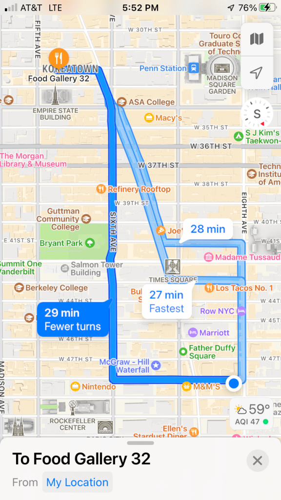 This was the harrowing journey from the hotel to West 32nd. Notice how I elected “fewer turns,” even though it added a whole minute. For some reason, I didn’t think about the toll that a half hour of walking would take on a body that hasn’t experienced physical activity in over ten years. I mean, two years. Two years, because we’ve all been locked down and, boy, did that pandemic ever disrupt our daily routines. Not ten years because I swore, after the Falmouth Road Race, never to move again. For additional irony, I arrived and departed via the labyrinthine Penn Station, which as you can see is adjacent to Koreatown and a whole long walk from the hotel. I chose that hotel based on its proximity to the Office theater.