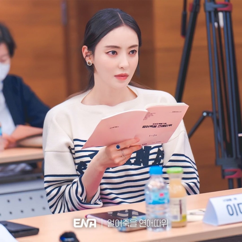 The first image is from the table read, where Lee gives off pretty classic Lee vibes. According to NME, she plays a character named “Goo Yeo-reum, a producing director who obsesses over Kingdom of Love after repeatedly helming programs that have been discontinued.” Kingdom of Love is an in-universe reality show, so it sounds like Lee will draw on her own experiences behind-the-scenes of Queendom, Road to Kingdom, and Single’s Inferno — as well as playing Cha-hyeon, perhaps.