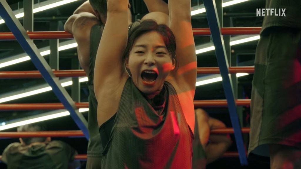 However, I’d be more than willing to posit that Physical: 100 is a new kind of even Asian reality show, which is the post-Squid Game competition. When that first guy comes in, there is no exterior, establishing shot. We’re trapped in this series of mysterious arenas with a disembodied host doing his best Lee Byung-hun. And like Squid Game, which was upfront about gender, Physical: 100 is egalitarian. Khang Mi is a special forces soldier, there are female bodybuilders, two absolutely vicious female boxers, and one curious cheerleader. When she walks in, 24 and K-pop pretty, some of the guys gawk, but one dude leans into another and remarks that cheerleaders have to be fit to do somersaults and fly in the air.