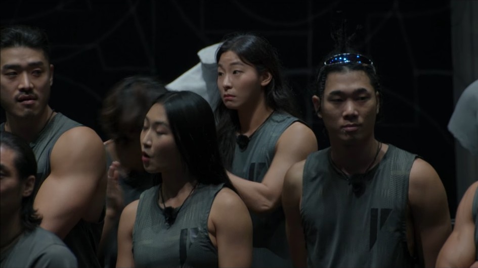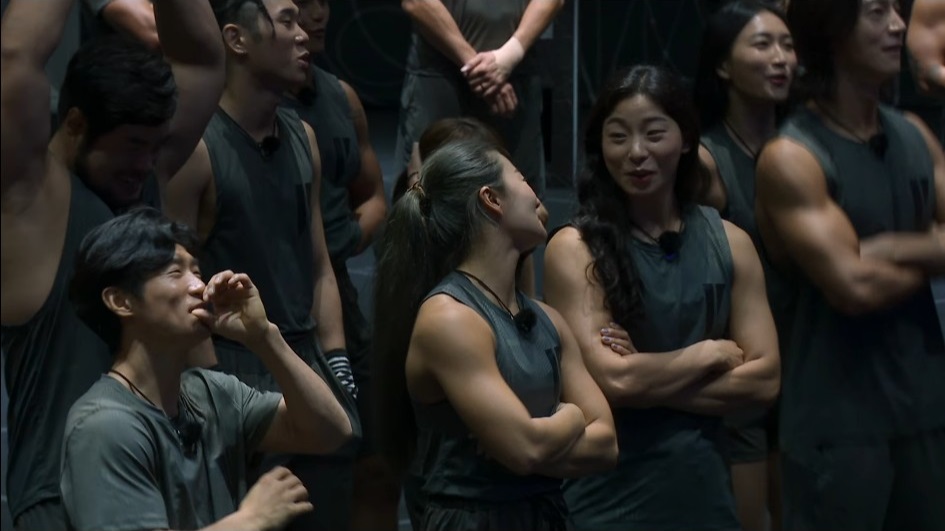No score card this time. Contestants simply walk over to the team leader they want, which creates an honest and unmistakable visual, with most of the crowd weighted toward the top five. Only one contestant chose Eun-sil: Seo Ha-yan, a CrossFitter. The host explains that team leaders with more than five prospective team members will have to make cuts, so Eun-sil will actually be saddled with stragglers. The pre-quest winner is cut from the first team, but finds his home soon enough. Important here is balance, yet another lesson we learn from Squid Game, when Gi-hun also took on rejects like the old man and a bunch of girls. Just lean back, everybody.