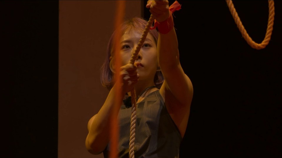 These torso busts are 40% of their corresponding contestant’s body weight. The challenge of Quest 2.5 is to hold onto a rope and ensure the bust doesn’t plummet to the earth. The pink-haired woman whose elimination I whined about last time – Shim Eu-ddeum – says that she’s gonna hold on even if it kills her. Of course, this would seem to be another challenge where the huge dudes have the advantage, but then again, they’re handling more weight. It’s tough to say.