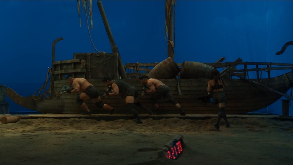 Now in the event room, with the big ship, each team is charged with loading it up with ten barrels – one of which has to be released from a locked crate – and then use logs to roll the ship over to the ramp, where they’ll attach it to a pulley and eventually a stake. To start, twenty people will be doing three different jobs simultaneously, so it’s a lot of activity when the whistle blows. Less of a concern is that there are suddenly two team leaders (something Eun-sil won’t have to deal with), but in the first round, Sung-hoon steps up and Jin-hyeong takes a support role.