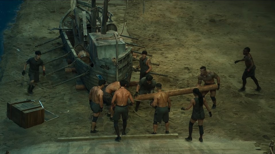 It’s a good call, because everyone’s gonna listen to Sexyama. Even though nobody can stand at a distance and direct, Sung-hoon is really sharp about recognizing what needs to happen, like when the ship starts to drift to the right, or that big problem of even moving the damn thing in the first place. All twenty holding onto the decorative oars and pushing forward can’t make it budge, so they switch to lifting and pushing at the same time, which edges it onto the logs. And with the logs, they have to run out and replace the one at the front to keep the boat sailing. “Our teamwork is almost perfect.”