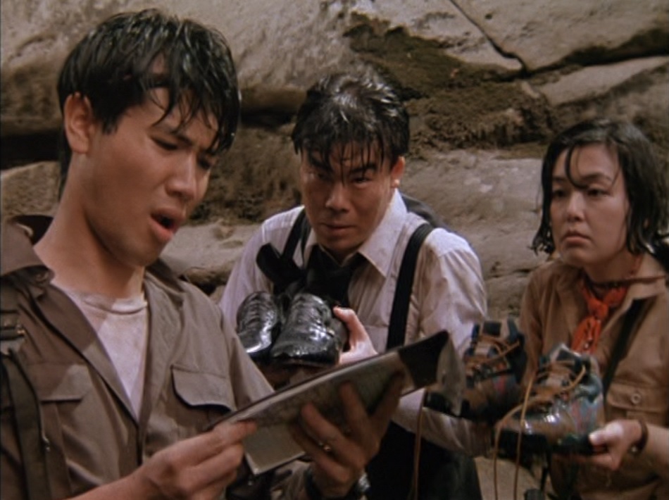 He’s also, if you were wondering, Indiana Jones. He has the hat, and this movie was a few months before the Japanese release of Jurassic Park, which updated the jungle adventure from its roots in, say, King Solomon’s Mines. For now, we have golden idols and rickety bridges. And comedy? Apart from a few MPAA headaches, Indiana Jones is mostly a family-friendly ordeal, so accordingly, Godzilla and Mothra acquits itself with a couple of conspicuous jokes. After the bridge breaks and Takuya, Masako, and a company man named Ando fall into the river, Takuya realizes that it would’ve been easier to simply follow the river and obviate this dangerous route altogether. Masako and Ando pop into frame and dump water out of their shoes as the punchline. Come on, guys. And look, I realize childish humor isn’t something to criticize, doing so might suggest I jump at threats to some sort of idealized “dark” Godzilla, but in this case, I do think it comes at the cost of actual characterization.