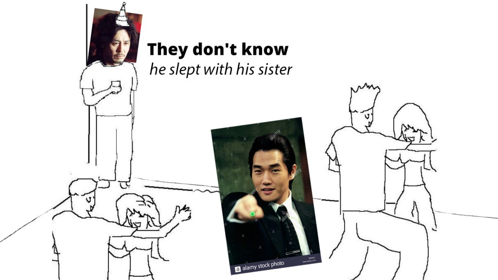 Just as I’d love watching others watch the twist, someone else watched me first – and if I’m being 100% honest, I didn’t even put it together right away. “Wait, so he… with his…?” It wasn’t the “OH, NO” that Donovan gave me years later. This was back in the late 2000s, when Netflix was mostly a DVD-by-mail service, and sometimes a movie would be available to stream, with a nice blue “play” bar under the red or grey “rent.” Both Sympathy for Mr. Vengeance and Lady Vengeance were available then, if you can believe that, and I cleaved to both like I had with Joint Security Area. I was astonished by Sympathy. I thought – and still do – that it’s the most disturbing movie I’ve ever seen (that’s also still good and not a documentary). And then Lady Vengeance, my God, with its prison rape and dinner rape and its, like, general air of violence – toward women, children, animals. This Park Chan-wook guy is fucked!