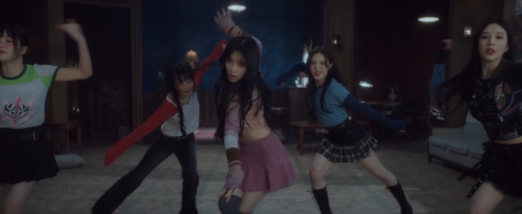 At around 40 seconds (of the song itself, not the video), the already minimal instrumentals drop out heading into the pre-chorus. The first verse is effective and the pre-chorus reminds me of the energetic “Player” from the Solid State Society soundtrack, but there’s nothing to connect them. There’s no “narrative” here. The pre-chorus builds up to a reversal, with the bright “Hey!” and then the sound again changes dramatically. It’s a lot of back and forth that feels like rug-pulls. The chorus is at first staccato and then we have the harmonized “What a chill kill,” taking us into the most discombobulating Red Velvet lyric ever: “Bring me lightning / Like a winner!”