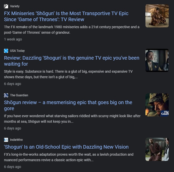 It’s March now, so we’re nearing the end of the first quarter of our entertainment year, which is exactly how entertainment is measured. I have to say, of the titles I previewed in this earlier post, not one that I’ve seen has been good. I like Gyeongsong Creature, but it’s so deeply flawed that the flaws become its very substance, for one’s acceptance or rejection — I don’t think it cares either way. I found Echo to be empty, and True Detective: Night Country uneventful. One show I did not list was FX/Hulu’s Shogun, something I’d seen in snippets last year for my job and assumed, when it made landfall, it would be brushed off as hoary-old white-savior nonsense. Wow, how wrong I was.