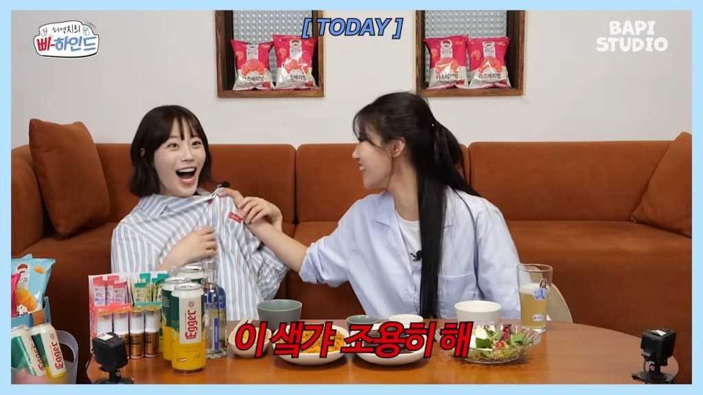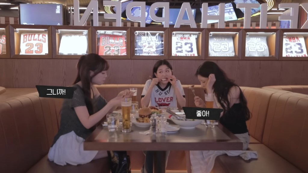 And you can see it here when they’re getting… lunch? I mean, they’re a couple beers deep and the traditional banchan is, like, hamburgers. But Youngji and Mijoo are doing Crossfire across the table and Seulgi’s in the middle just trying to keep up.