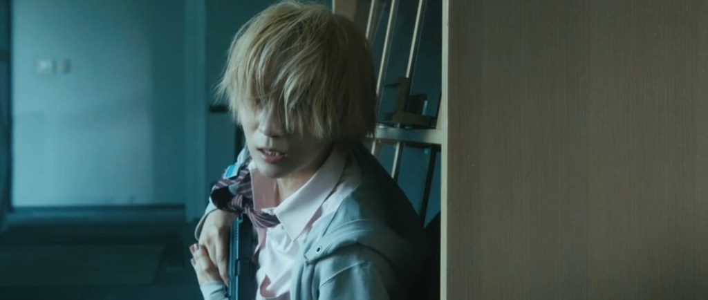 Our resident badass is Akira Fukami, and long ago, he lived an innocent life as a little boy on a tricycle when his yakuza father was shot to death in front of him. He’s taken in and raised by his dad’s friend, fellow yakuza guy Yoshiki Majima, and we flash-forward to when Fukami’s a brooding adult mopping the floors at a high school in order to keep an eye on Majima’s daughter Yui. We have to trust that, at some point, Yui will be targeted for termination and Fukami will indeed spring into action, which happens, but what does the whole janitor thing add to that equation? He mops some floors, says nothing, and has a couple of encounters with student bullies, who are introduced bullying a teacher. The lead bully punches Fukami in the face, and he doesn’t fight back, presumably to not blow his cover. And then the plot shifts into the springing!