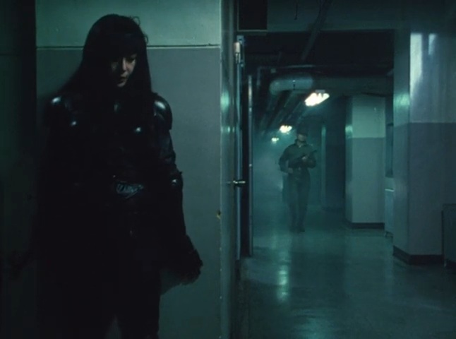 It’s strange, because there’s nothing original about a zombie movie, so you’d assume that the script would be straightforward enough to avoid these sorts of head-scratchers. Earlier, a gang of ruffians attacks an innocent couple, beating up the guy and dragging off the woman. Surely, this is when Keiko comes in to save the day. No, actually, as this sequence is meant to introduce the zombie concept, that – might you not know – the dead woman will come back to life and bite the neck of the husband cradling her, all while Keiko watches. This is when the bus shows up. Shortly thereafter, Keiko arrives in a nondescript room off a nondescript hallway (was she headed there all along?) and is introduced to something called the “Battle Suit” by her father via video recording. A great sigh of relief. Cue a fairly poor suit-up sequence where she’s already suited up and just presses on her arms and legs as if fitting things into place. It’s no John Matrix.