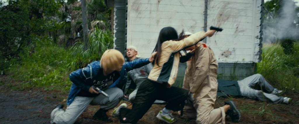 In a lot of ways, the Baby Assassins series has felt like a budget John Wick, with the same aspirations toward world-building but no means to fully realize them. In trying and failing, it actually ends up squeezing just enough flavor out of that lemon. A proper spritz of exposition lets us know that Fuyumura is part of an “agricultural” assassin conclave, which means that they work on a farm – referred to as “The Farm” – and they pack crates with handguns topped by concealing bell peppers. And that’s pretty much it. The farm theme never becomes a thing, beyond a supply for cannon fodder. At the same time, writer/director Yugo Sakamoto is thoughtful enough that the cannon fodder indeed comes from somewhere. In this case, it’s a scene where a blood-splattered Fuyumura rallies his troops with a sort of “might makes right” speech that could only come from a skinner-box upbringing. Elsewhere, our four heroes regroup at a safe house in the jungle which looks like a half-finished playground, or an obstacle course. If it sounds like the movie is headed for its final stretch, it is, but we’re somehow only halfway through a two-hour runtime. What follows is a protracted climactic sequence made up of absolutely jaw-dropping action set pieces.