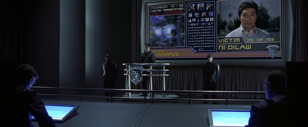 Part of what I appreciate is how much the premise feeds into the character, that it locks this Gabriel Yulaw into a limited set of motives and behaviors, and they’re all interesting choices. What kind of person goes around murdering their alternate-dimension copies? Probably a vain, evil guy, and that’s exactly what we see. Yulaw is obsessed but having fun, an agent of chaos like Simon Phoenix before him, and he wreaks his PG-13 havoc on a multiverse of cops, including one played by – you guessed it – Dean Norris. The problem, however, is that Yulaw becomes the driver of the movie’s plot, rendering Gabe entirely reactive. On paper, this is screenwriting 101 stuff and might sound like a useless gotcha like that science fiction rule, but in practice, it leaves The One with a protagonist vacuum, as well as an unmooring lack of subjectivity. Gabe is so simple and boring and we always know what he’s doing so we never need to access his headspace. Why is he doing this? Because of Yulaw, and on and on. To jump to the end, Gabe and Yulaw teleport to the police station of the future wearing identical clothes, and we don’t know who’s who, but Funsch deduces that they’re about to execute Gabe because of the wedding ring mark on his finger. This is an exact description of the scene and all its emotions; there’s no suspense, no feeling of impending doom or a frantic need for Gabe to prove his identity. We’re not with him.