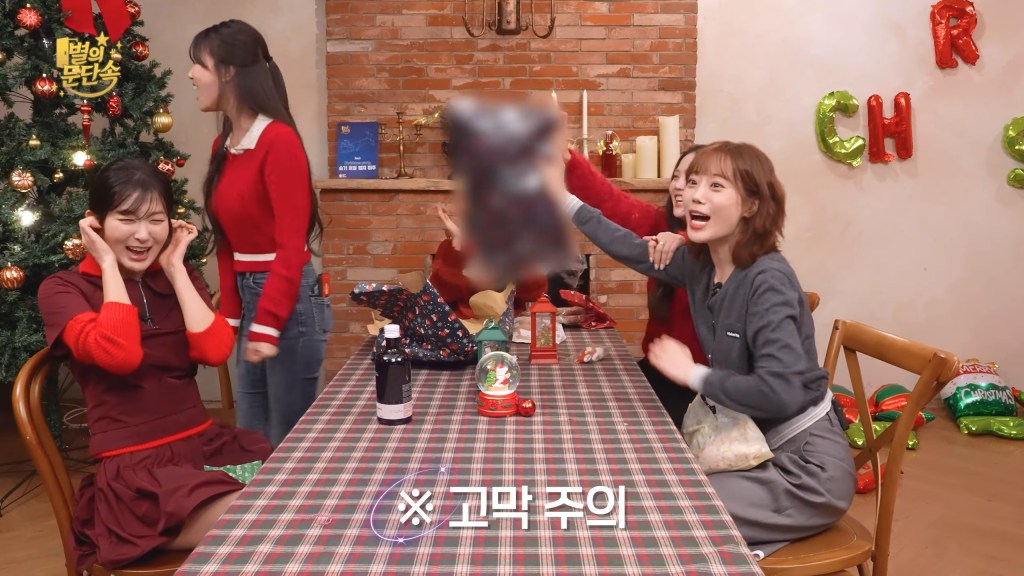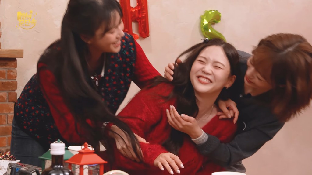 They then hang up balloon letters spelling out “Merry Christmas,” which gets everyone dancing. Or at least, Moonbyul and Youngji. Seulgi is already tired. Back at the table, Youngji asks about food for a second time, and gets an ad for something called Twozzim, which does look pretty good: braised short ribs of varying spice level. Youngji pours the makgeolli, first for the host, and then goes instinctively to her bestie Mijoo before asking who has the earlier birthday between her and Seulgi – it’s Seulgi. Youngji, apparently, is the youngest.