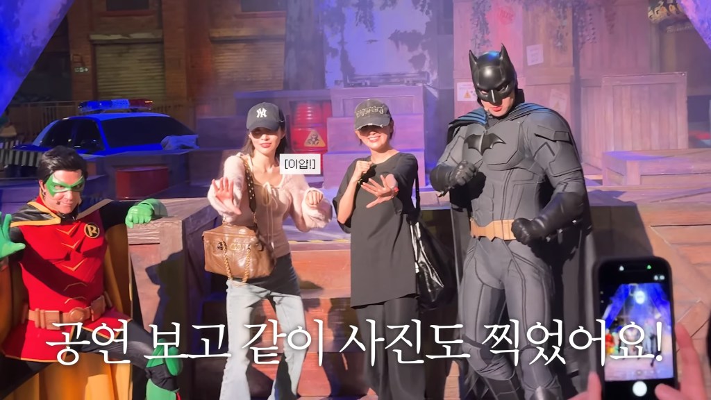 Yellow and Green then head to Warner Bros. World, with Flintstones and Scooby-Doo attractions and all their puffy, pastel-colored whimsy. Seulgi has a hard time in a hall of mirrors funhouse, and they get to meet Batman.