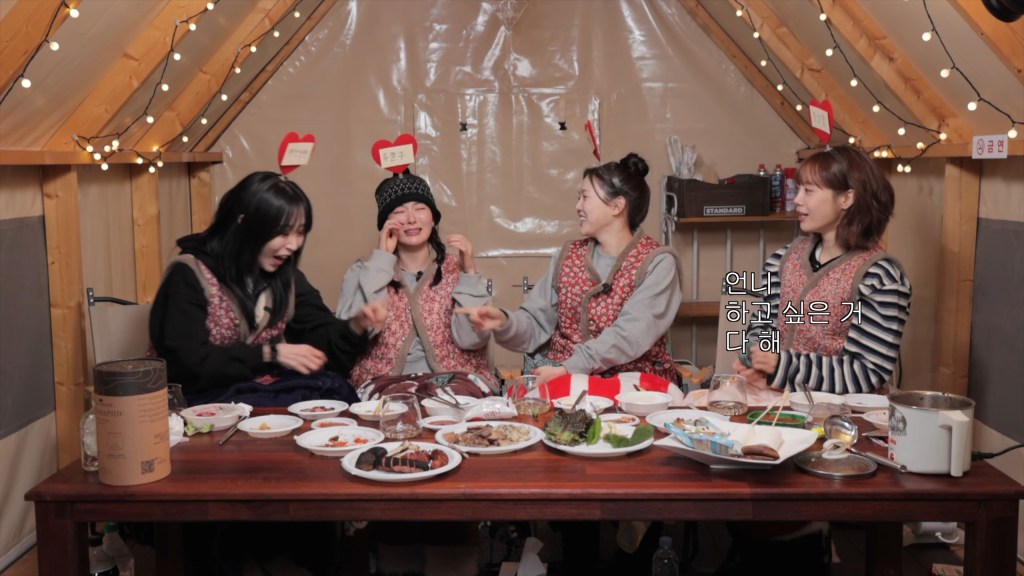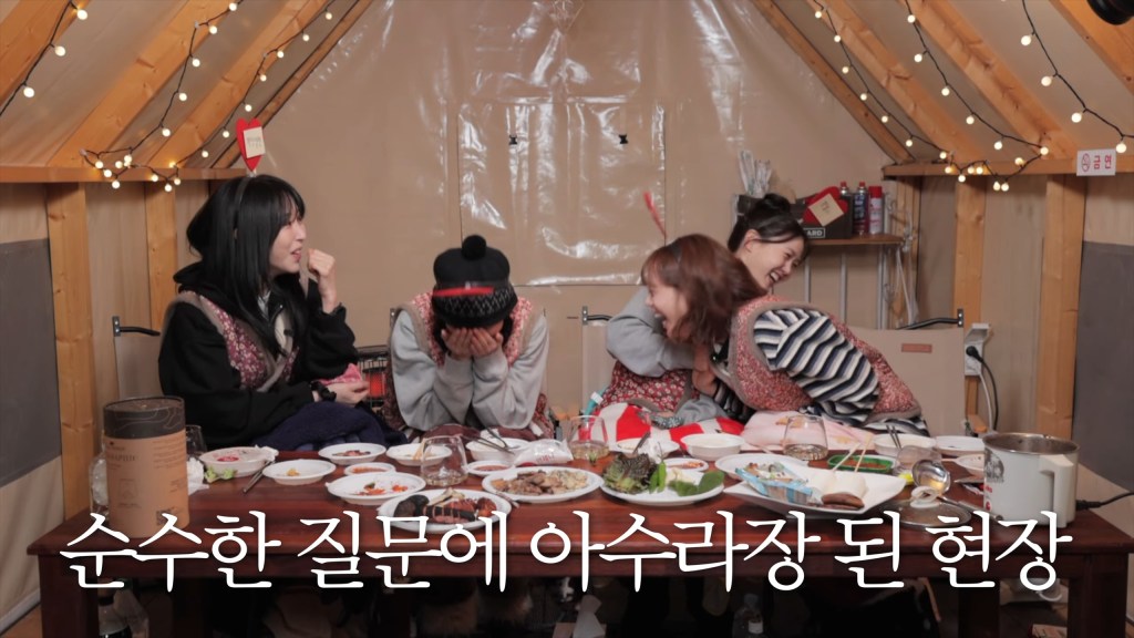 Anyway, they sit down for their half-burnt meat and raise a toast to the year that was. Hyojung says that she wants the five of them to perform on stage together, which Youngji immediately ups to a tour. “This is getting big,” Seulgi says in between bites. Of course, they’d have to sort this out with their agencies, but the more pressing issue is positions. Who would be the visual? Mijoo already called it, but since she’s not here, Seulgi suggests asking ChatGPT. Oh, Seulgi, please. Moonbyul pulls it up, and shockingly, the AI selects Seulgi to be the visual center. Wow! You know, the most famous one of the five, who’s on all those “hottest idols” lists. ChatGPT also comes up with a group name: Prism, which is actually not too bad. The alternative is Muse5. “What is this, Maroon 5?!” Youngji then shouts.