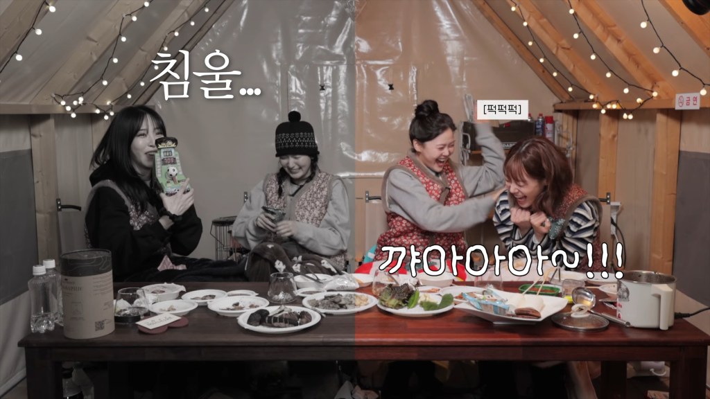 The video editors also remind us that Youngji’s prediction about this big Mijoo adventure involved a hotel room. Camping is too much work, and it’s also winter. But the digs turn out to be more accommodating than expected, looking like one of those weird Amazon houses they airdrop into the woods. I stayed in one of those for a wedding in Maine, and it was pretty eerie. I just love whenever Mijoo and Youngji both start shrieking in their play-acting anguish. So dramatic.