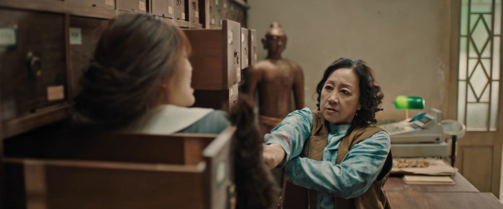 Her performance is enhanced by purposely unconvincing wirework and slow-motion and, in one early instance, on-screen graphics, making her generally straight-faced turn even more comic in contrast. The shenanigans truly begin, however, once blind Gui goes undercover as her long-lost son, who was reportedly plagued by medical issues in the orphanage, like the loss of eyesight. In another characterizing benchmark for the film, the ensuing “reunion” is surprisingly low-key. Liang is happy to have her son back, but there’s no big show of emotion. She puts him to work at the herbal medicine clinic, developing a strange rapport with this snide gangster who’s surreptitiously waiting for an opening to kill her. And they sleep in the same bed for some reason. I guess it’s because this is one of those weird comedies about a mother and son, where a lot of the humor derives from infantilization and embarrassment. “Mo-om!”
